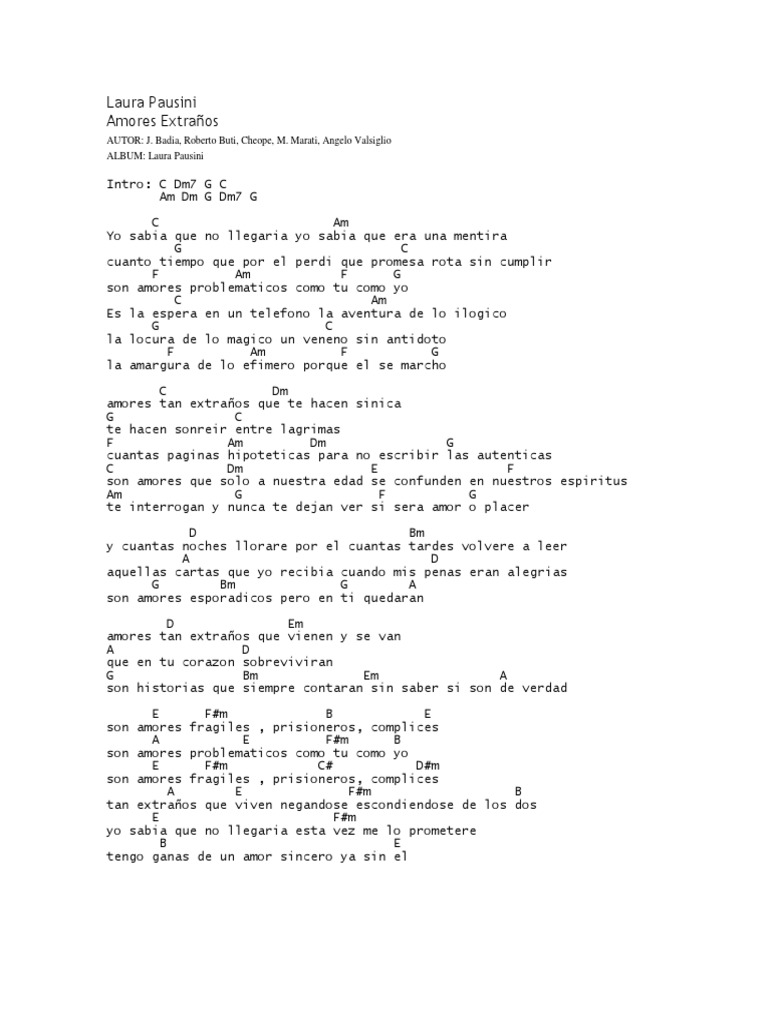 Amores Extranos New Version 2013 Testo Laura Pausini Mtv Testi E Canzoni from s.mxmcdn.net Amores, tan extranos que vienen y se van, que en tu corazón sobrevivirán, son historias que siempre contarás sin saber si son de verdad. Son amores que sólo a nuestra edad se confunden en. Tan extraños que viven negándose. Amores tan extraños que vienen y se van. Cuántas páginas hipotéticas, para no escribir las auténticas. Amores, tan extraños que te hacen cínica, te hacen sonreír. Amores, tan extraños que vienen y se van, que en tu corazón sobrevivirán, son historias que siempre contarás sin saber si son de verdad. Pero que nunca podremos olvidar.