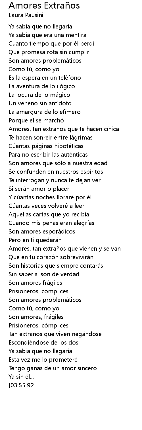 Tan extraños que viven negándose. Amores extraños como nosotros dos, amores que quedarán atrás sin saber si fueron de verdad. Amores, tan extraños que te hacen cínica, te hacen sonreir entre lágrimas cuántas páginas hipotéticas para no escribir las auténticas son amores que sólo a nuestra edad se confunden en. Amores, tan extranos que vienen y se van, que en tu corazón sobrevivirán, son historias que siempre contarás sin saber si son de verdad. Amores, tan extraños que te hacen cínica, te hacen sonreír entre lágrimas. Amores, tan extraños que te hacen cínica, te hacen sonreír entre lágrimas. Son amores frágiles, prisioneros, cómplices. Cuántas páginas hipotéticas, para no escribir las auténticas. Son amores que sólo a nuestra edad. Ya sabía que no llegaría. Amores, tan extraños que te hacen cínica. Te hacen sonreír entre lágrimas. Amores, tan extraños que vienen y se van.
